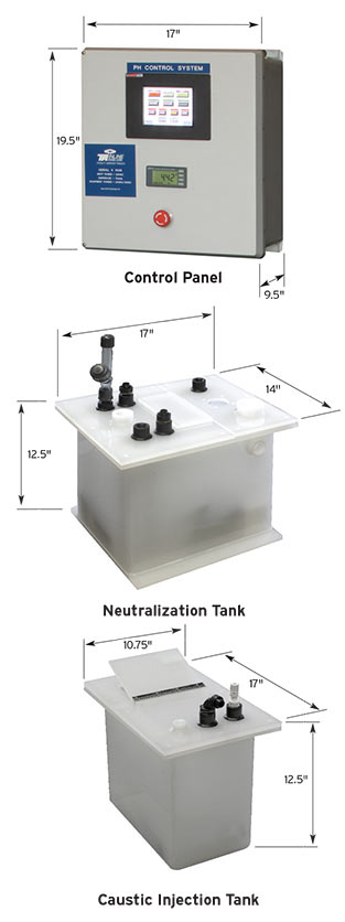 environment. When neutralization is required to reduce high water usage, this system will neutralize hazardous acids by adding a metered amount of caustic solution to bring the pH within a 7.00 + – .02 neutral condition. Since tank sizes can be increased or decreased as required, this product can be used for any system requiring pH control/neutralization of acids within a laboratory or processing environment.